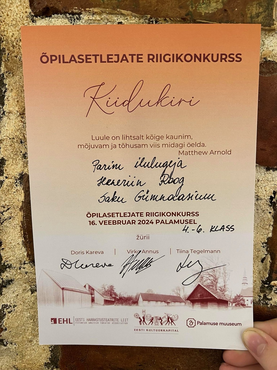 16. veebruaril toimus Palamuse muuseumis riiklik õpilasetlejate konkurss, kus Harjumaad esindas meie klassi õpilane Heneriin. Oskar Lutsu “Kevadest” tuntud klassiruumis kandis ta ette Priit Aimla luuletuse “Möllulaul” ja Eno Raua proosapala “Raadio”. Žürii tunnistas kuuldud esituse laureaaditiitli vääriliseks ning andis välja kiidukirja “Parim ilulugeja”.