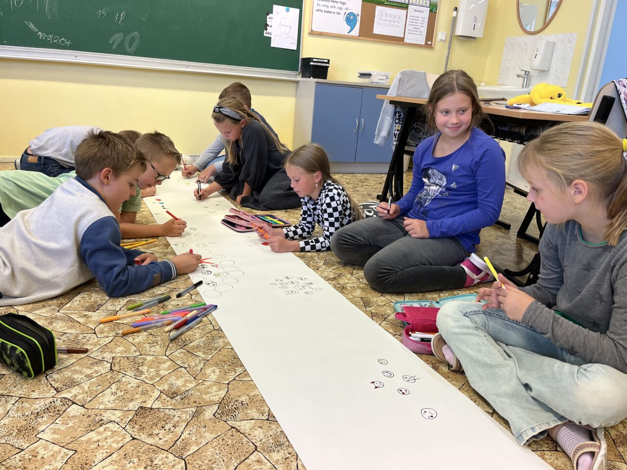 Seetõttu proovisime erinevaid emotsioone ära tunda ja väljendada. Teema kokkuvõtteks joonistasime emotsioonid ka ühiselt ülesse.