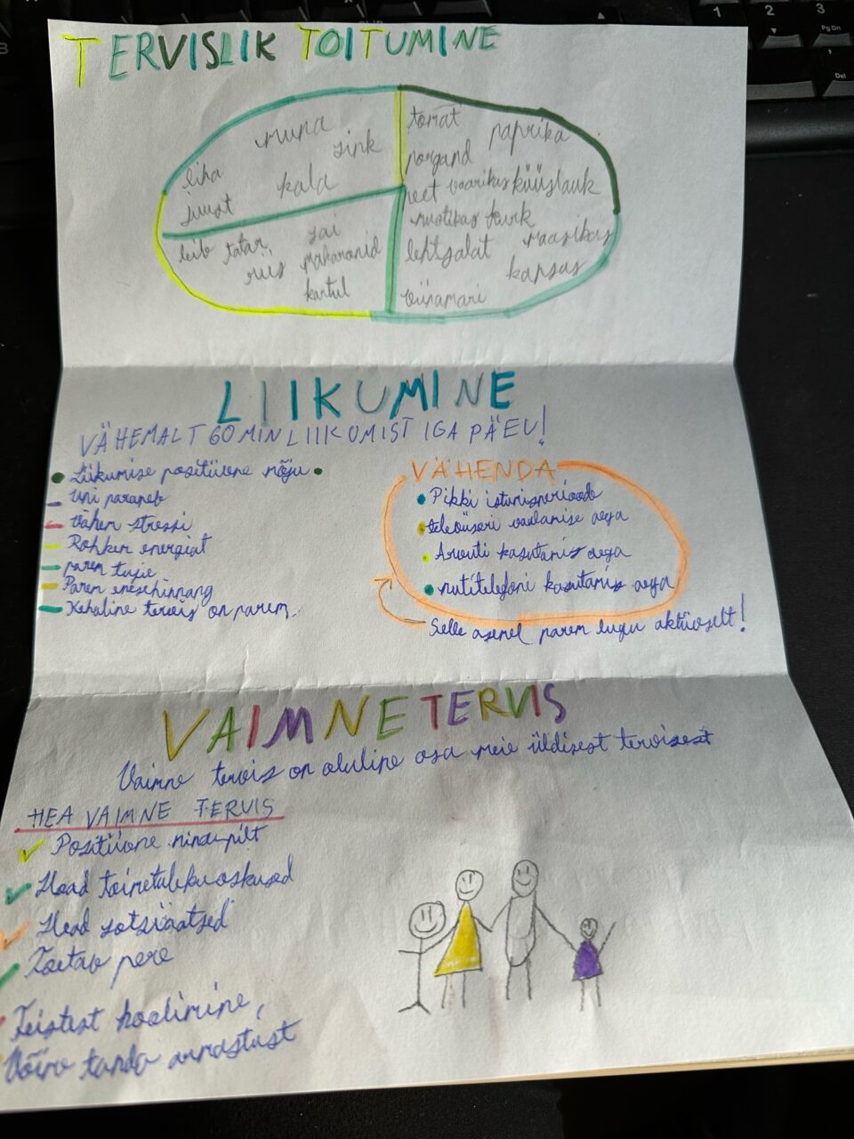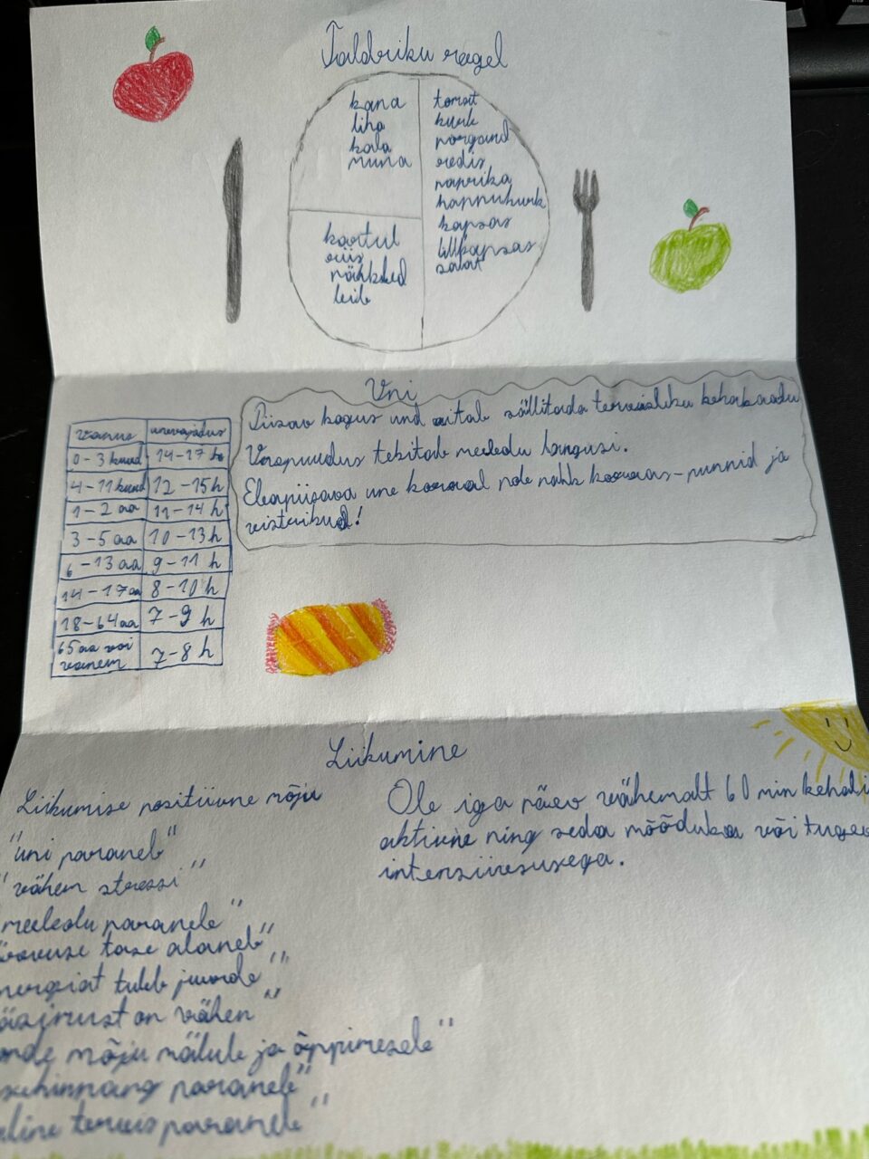Tervisepäev on pühendatud tervisliku eluviisi edendamisele. Meie rääkisime ühiselt nii toitumisest, unest, liikumisest kui ka vaimsest tervisest. Teadvustasime, et tervislike valikute tegemine aitab vältida terviseprobleeme, tõsta üldist heaolu ja õpivõimet, sealjuures toetades soovi kaaslastega koos tegutseda. Seekord kutsusime endale külla Johanni ema Jaana, kes pani meid mõtlema erinevatel teemadel. Mida me peaksime sööma iga päev? Millal süüa? Miks pole hea palju magusat süüa? Õppisime kasutama MINA-sõnumit ning tegime ühise sammude lugemise kooli ümbruses. Teema kokkuvõtteks jäi igale õpilasele ülesandeks koostada infovoldik „Tervislikud eluviisid“.